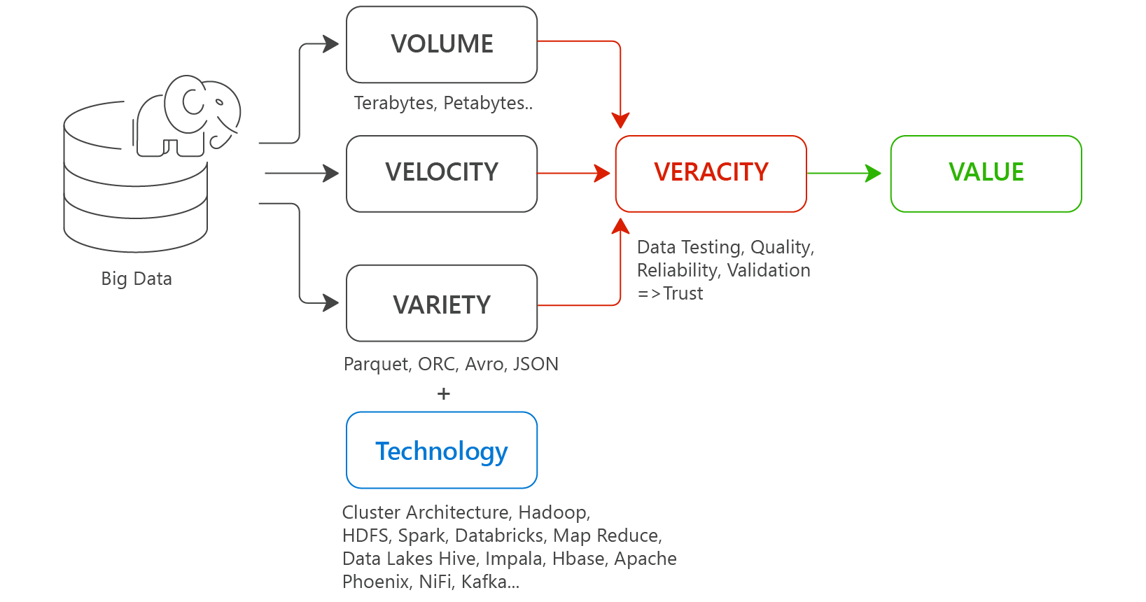 - Velocity: Data quality verification across heterogeneous sources (big data veracity is a measure of the accuracy, completeness, and currency of the data).