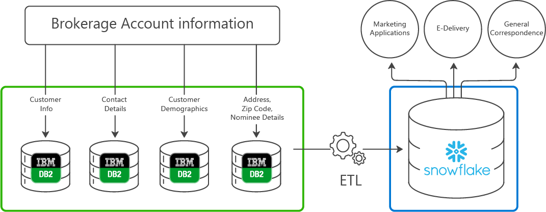 It was difficult for downstream apps to access this data from multiple DB2 databases. Hence, this scattered data was consolidated with daily ETL batch into a centralized Snowflake cloud.